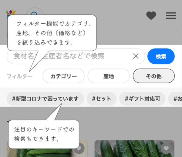 生産地は47都道府県から選べるようになりました。さらに、注目のキーワードから気になるワードを選ぶだけで検索することもできます。