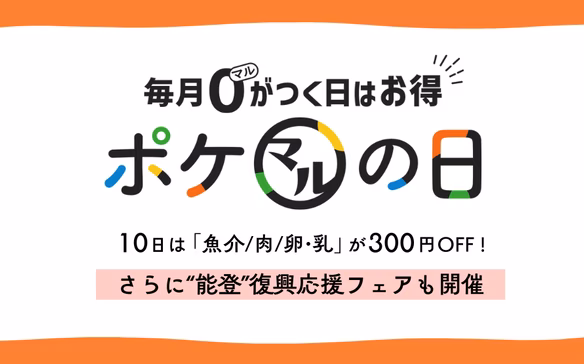 本日10日はポケマルの日!魚介類、肉、卵・乳製品が300円オフ♪ さらに、本日は「能登復興応援フェア」も開催中!