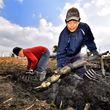 レンコンの収穫方法には水を使う「水圧堀り(水堀り)」と、1本1本掘る「手堀り」があります。今では時間が半分で済む「水堀り」が主流になりつつありますが、 レンコンに傷がつかないよう、畑の水を抜き、1本1本時間をかけて「手堀り」で収穫しています。
