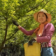 私は4年ほど放置された梅林(およそ100本)を借りて、農薬、化学肥料、除草剤は一切使わずに梅を育てています。農園は、虫や鳥たちがたくさん飛び交う環境です。草を適度に生やし、木をたくさん透かして風通しを良くして病気が出にくくしています。また、剪定した枝や篠竹を炭にして、土に還元することにより、地中の微生物を増やし病害虫の発生を抑えます。