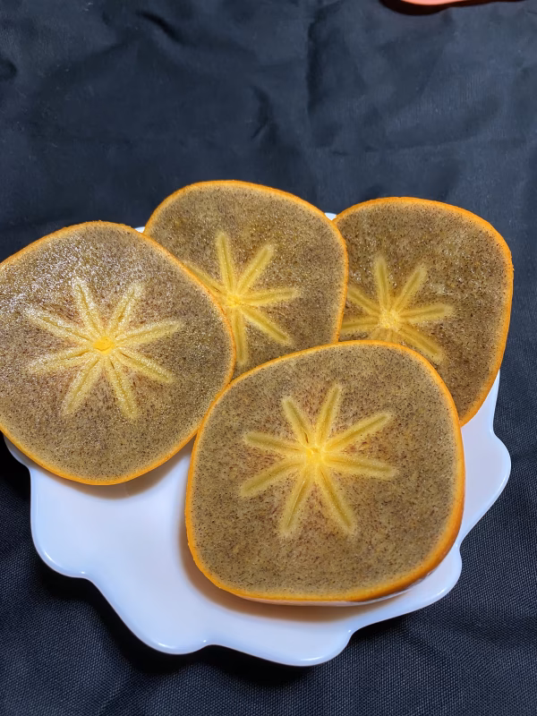 果肉は黒く通常のたねなし柿よりも糖度が高いと言われております。横に切ると全体が黒くたねが本来入るべき所は白くまるで夜空の花火の様な模様が特徴です。シャキシャキとした食感です。