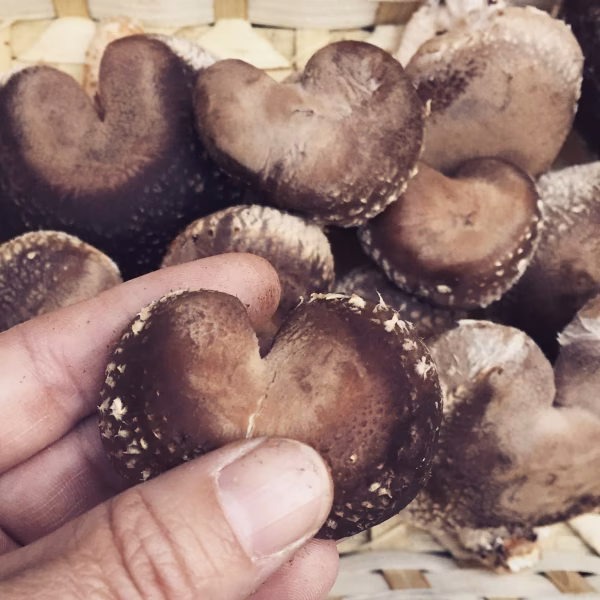 ダメしいだけど可愛すぎ!今日のご注文分には、ハート型のしいたけ(ダメしい)5個をおまけにつけます。