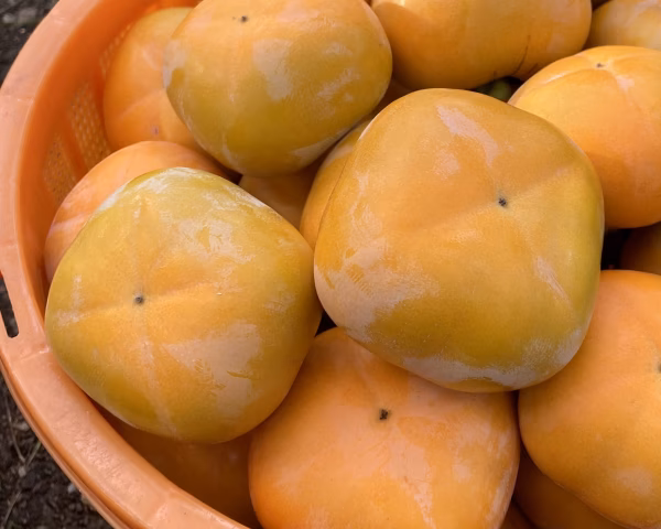 台風の頃にはまだ小さかった我が園の最終柿。数が小さいため出品は諦めていましたが、とても綺麗に仕上がってくれたので、少しですが食べていただきたくなりました。甘味も増した柿で名残惜しい秋をお楽しみください。