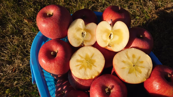 標高780mに位置する麻績村では寒暖差が厳しく、蜜入りのサンふじはパキッとした硬さが特徴です