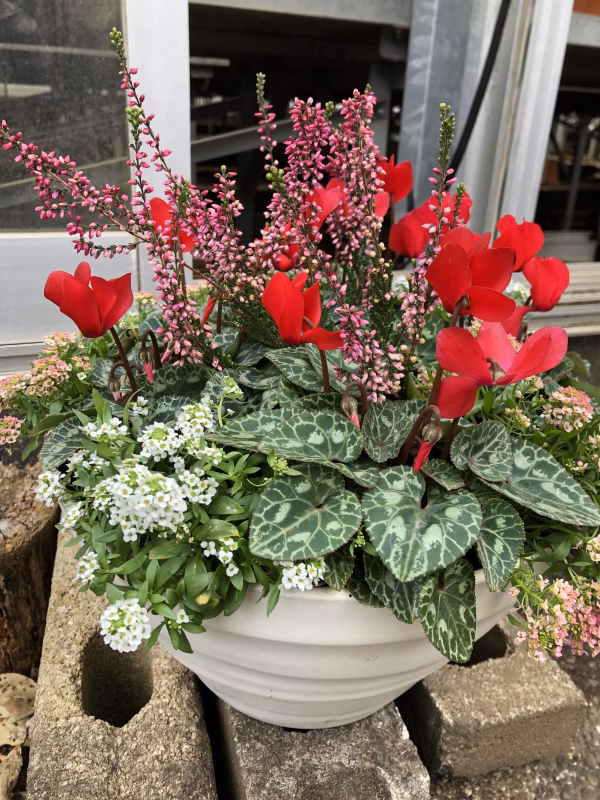 ガーデンシクラメン、アリッサム、カルーナの3種をバランス良く植え込み、見応えたっぷりです。ガーデンシクラメンは、【スーパーコンパクト ソーラーレッド】を5株使用