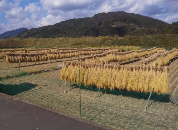 田植えは二条植えの田植え機で水の張った田んぼの中へ入り直に歩いて植え付けます。植え付けた後は何度も田んぼの中を歩いて稗などの雑草を手で取り、猛暑や台風などの自然災害を心配しながら収穫の時を迎え、一条ずつバインダーで歩いて刈り取り、はざかけし天日干しします。この天日干しでお米の一粒一粒にさらにぎゅっと美味しさが詰まっていきます。そして、タイミングを見てハーベスタで一束一束脱穀し、籾すりをして完成です。