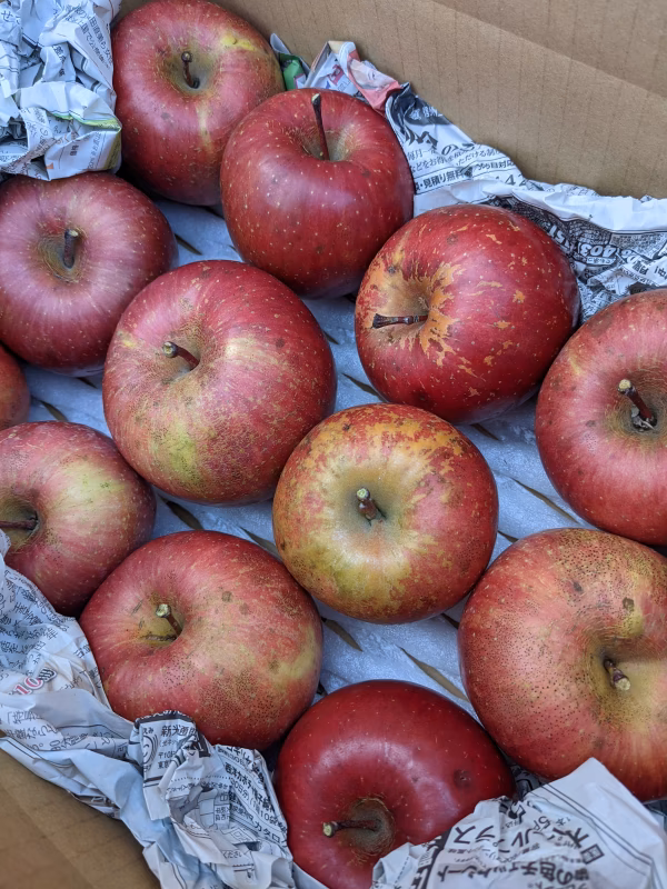 梱包は下に一枚りんご用のノバシートを敷いた上にりんごを並べ、隙間に新聞紙を詰めるのみとなっております。配送中にあたってしまうことなどもありますが、お早めにお召し上がり頂けますようお願いしておりますのでよろしくお願いいたします。