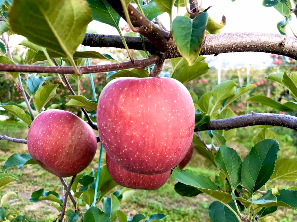 🍎サンふじりんごの「サン」は「太陽(SUN)」を意味していて、袋をかけずに太陽の光をたくさん浴びて育ったことを指しています。無袋栽培で育てたことにより光をたくさん浴びるので甘味が増して味もよいとされます。