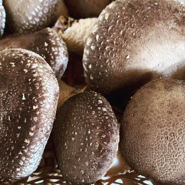 自然の影響を大いに受ける簡単な手作りハウス(雨と若干の虫の害を防ぐため)で、ほだ木一本一本の状態を見極めながら育てています。
