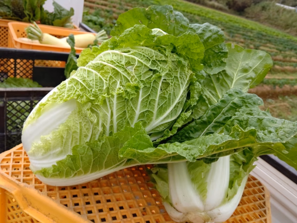 白菜、深ネギ、春菊、小松菜、タアサイ、チンゲン菜、サラダ白菜、ほうれんそう、フリルケールヴェルデ、にら、大根、キャベツの中から食べ頃のものを7品目程度入れさせて頂きます。