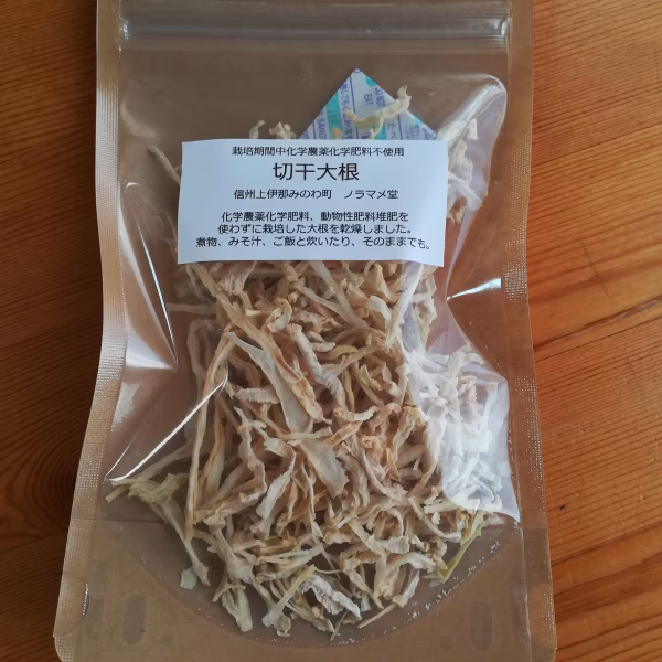 化学農薬、化学肥料、動物性の堆肥、肥料を使わずに栽培した大根を切り干し大根に、その葉も乾燥させました(葉は、小松菜など他のアブラナ科の葉と同じ緑黄色野菜です)。