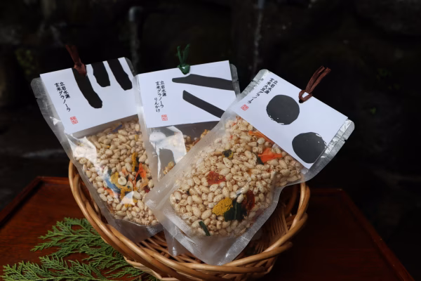 立岩水源の水で育った玄米のポン菓子とお母さんたちが丹精込めて育てたお野菜やくだものをギュッと詰め込みました。一切添加物を加えていないので、素材そのものの天然のやさしい味をお楽しみいただけます。