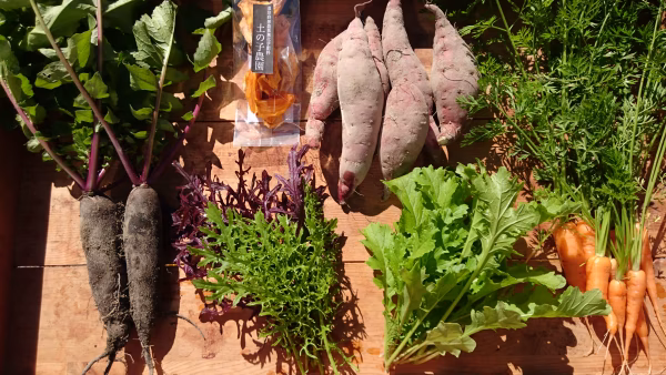 セット内容:マスタード葉っぱ+旬の野菜5種類+農家のおすそわけ(例:マスタード葉っぱ、さつまいも、黒大根、間引き人参、葉物、乾燥かき、おまけ、簡単なレシピ)