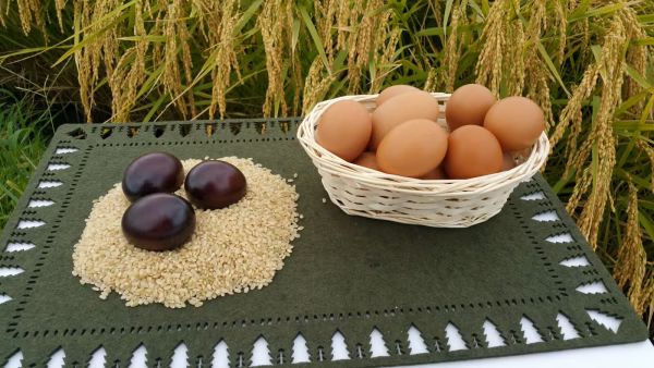 餌は飼料米、とうもろこし、米ぬか、葉物、コオロギなど、好きな時間に自由に食べています。