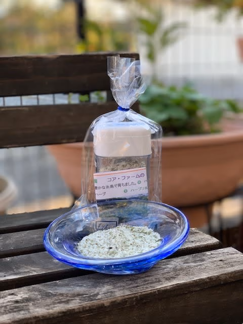 - ●商品名/糸島コアファームのハーブソルト ●材料/ドライハーブ(ローズマリー、バジル、オレガノ、レモンバーム、タイム、フェンネル、マジョラム)塩(糸島自然結晶天日干し自然塩)スパイス(スリランカブラックペッパ) ●製造日/注文後製造4日以内にお届け●保存/湿気を避けて保存 ●生産者/ハーブ・薬香農園コアファーム・藤本蔦枝