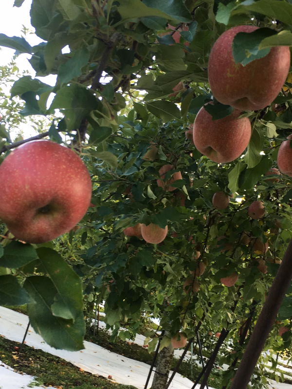 あまり葉をとらず栽培、またいわゆる着色系ではないスタンダードのふじです。葉をとらないと着色は劣りますがその分光合成しているので糖度は増しています。