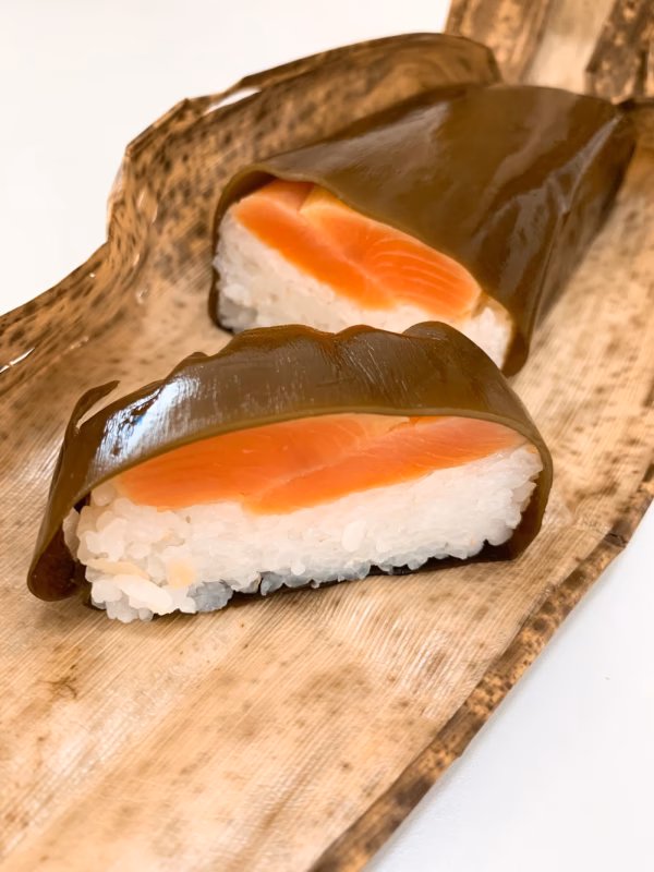 ほどよく脂ののったサクラマスと甘めの酢飯を松前昆布で包んで仕上げた寿司です。昆布と一緒にお召し上がりください。