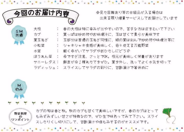 ●春の一例● キャベツ1個、葉付きにんじん1袋、カブ(大)2~3玉、大根(短)1本、小松菜1袋、スナップエンドウ1袋、茎ブロッコリ1袋、新玉ねぎ3~5個、サニーレタス1株、チンゲン菜1袋、水菜1袋、葉ねぎ1袋