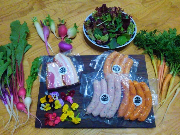 この商品は、年末年始の特別なテーブルを彩るカラフルな野菜とエディブルフラワーに、レストランでも使用している自社シャルキュティエ(食肉加工の技術者)おすすめのソーセージやベーコンを詰め合わせたセットです。