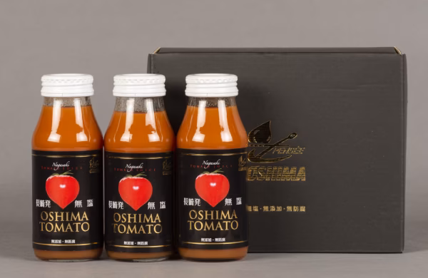 長崎県西海市大島町特産の大島トマトだけを丸ごと搾った無塩、無添加、無防腐の100%の天然ジュースです。大島トマトとはファーストという昔ながらの品種で、最小限の水と肥料だけを与えて育て、植物が本来持っている自生本能を高めたトマトです。また糖度基準を設けており糖度8度以上のトマトだけが大島トマトとして出荷されます。トマト本来の甘みと酸味のバランスが良く、凝縮された濃厚な味わいになっております。