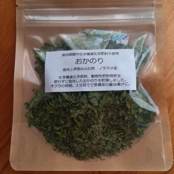 化学農薬、化学肥料、動物性の堆肥、肥料を使わずに栽培した「おかのり」を乾燥させました。