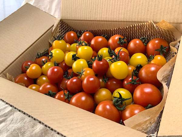 ダンボール箱にバラで詰め、ガムテープで梱包します。箱内の緩衝材はエアーキャップと紙を使います。一般的にスーパーで販売されているミニトマトが170から200gなので、ミニトマトパック6~7パック分に相当します。トマト好きな4人家族であれば1週間で食べきる量かと思います。完熟一歩手前で収穫しますので、お手元に届くころには完熟になります。25度以下常温保存で5日間、18℃以下冷暗所保存で7日間、冷蔵庫保存で10日間がお召し上がりいただける目安です。