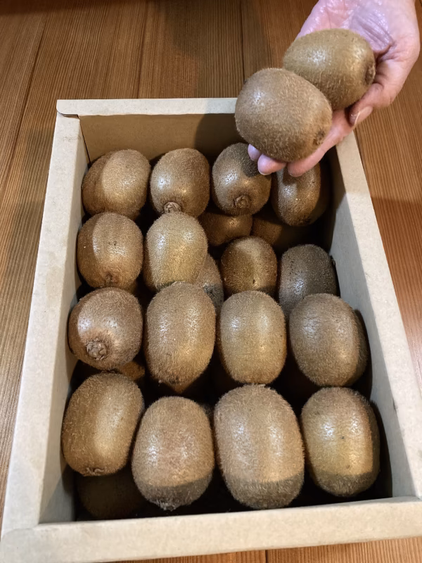 ▼キウイフルーツ  桃畑にあるキウイの樹です。  本数は少ないですが毎年、沢山の実を つけてくれます。 父が育てていますが、今年は高齢の為息子夫婦が収穫しました。 父は1日で収穫を終えていましたが、私たちでは2日以上かかり、なぜなのか。 父に教わる事がまだまだある事を気付かされました。 今年の出来は父が出来る範囲での畑仕事でしたので実が大量になりすぎました。 よって小ぶりですが、きれいなのが揃っていて満足です。 ▼12月11日に収穫しました。  収穫してすぐは若いので硬いです。  追熟しますので、お好みの柔らかさに  なる過程も楽しんでいただきたいで  す。  りんごと一緒に袋にいれておくと早く  熟します。 ▼訳ありとは  小ぶりです。  味は正規品とかわりません。  一箱に2㎏、32個前後です。  1年間大切に育てたキウイを  知っていただけたら幸いです。 ▼有機肥料で栽培し、除草剤は使っていません。