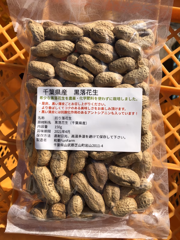 - 名称:煎り落花生 原材料名:黒落花生(千葉県産) 内容量:150グラム 賞味期限:2021年4月 保存方法:直射日光、高温多湿を避けて保存してください。 製造者:和栗FunFarm 千葉県山武郡芝山町岩山2011-4