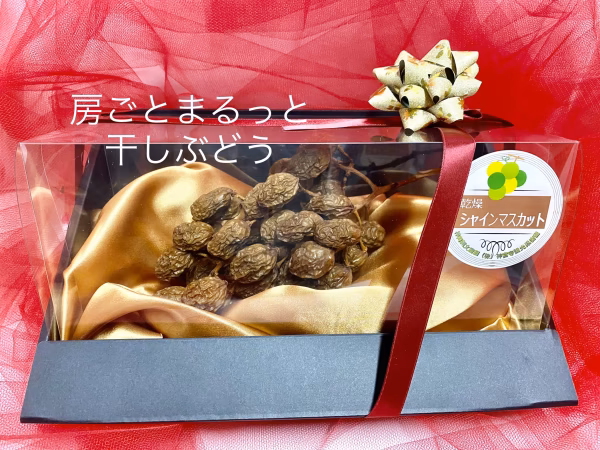 シャインマスカットを房ごとまるっと干しぶどうにしました。全国でも珍しい国産干しぶどうです。
