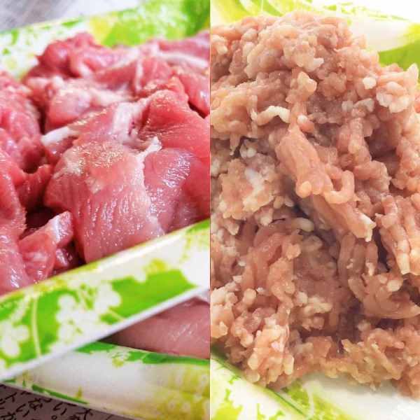 新鮮な豚モモ肉またはウデ肉を挽肉にしました。