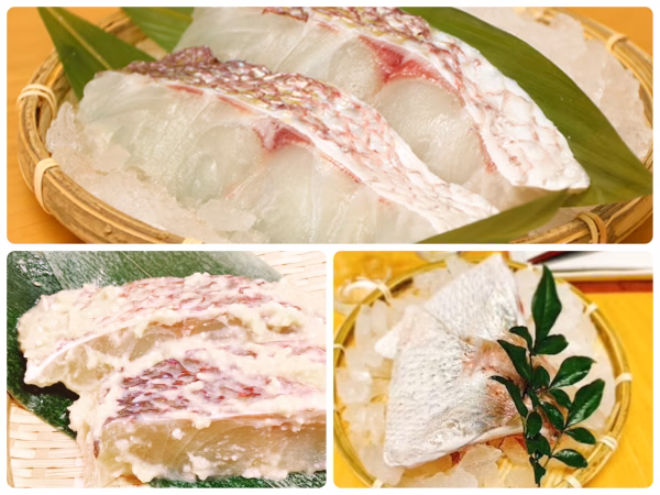 「真鯛の切り身(5パック/約350g)」「真鯛の西京漬け(5パック/約350g)」「真鯛のカマ(1対×5パック/750g)」