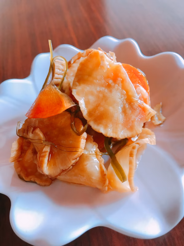 燻した大根を薄く切り、そこにアツアツの漬け汁をかけて漬け込みます。醤油、ザラメ、昆布、スルメ、唐辛子で甘辛く味付けしています。パリパリ大根の食感と甘辛とろーりの一度食べたら止まらない、いぶりがっことは違う秋田の味を楽しんでもらえたら嬉しいです。