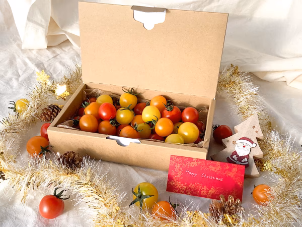 ダンボール箱にバラで詰め、クリスマス包装が傷まないようにエアーキャップで梱包し、ガムテープで梱包します。複数個お買い上げいただいた場合縦積みで梱包しますので、どうしてもリボンがつぶれてしまいます。商品到着後、手直ししていただきますようお願いいたします。箱内の緩衝材はエアーキャップと紙を使います。一般的にスーパーで販売されているミニトマトが170から200gなので、ミニトマトパック2~3パック分に相当します。トマト好きな4人家族であれば2~3日で食べきる量かと思います。完熟一歩手前で収穫しますので、お手元に届くころには完熟になります。25度以下常温保存で5日間、18℃以下冷暗所保存で7日間、冷蔵庫保存で10日間がお召し上がりいただける目安です。