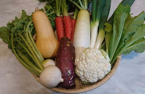 冬野菜セットの内容は、大根、バターナッツカボチャ、ブロッコリー(またはカリフラワー)太ネギ、ニンジン、サツマイモ、辛味大根、正月菜(またはホウレンソウ)などこの季節ならではの美味しい野菜が勢ぞろいです。大根は甘くみずみずしく生でも煮ても美味しいと評判です。バターナッツカボチャはスープにするとバターナッツ味で濃厚な甘さと香りがたまりません。辛味大根は、大根おろしにして蕎麦やうどんの薬味や鍋にもあいます。