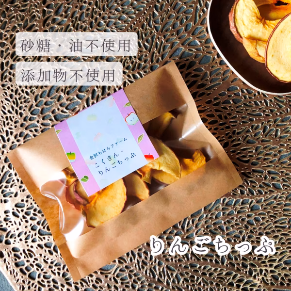 - 名称:乾燥果実 原材料名:りんご(石川県産) 内容量:23g 保存方法:直射日光、高温多湿な場所を避けて保存してください。 製造者:(株)金沢ちはらファーム 石川県金沢市玉鉾3-300 TEL076-291-9683