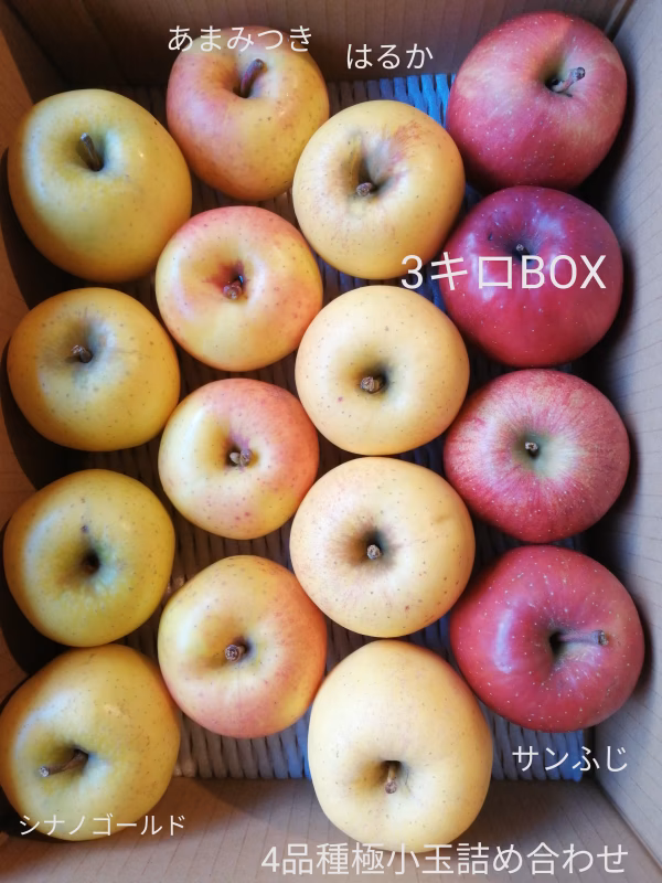 サンふじ、シナノゴールド、はるか、あまみつきの極小玉の詰め合わせになります。