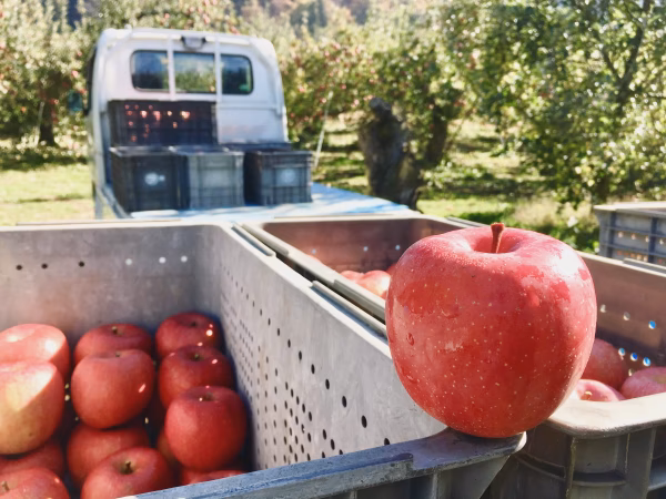 "ふじ"は特に、4月下旬に花が咲き、収穫は11月中旬頃。約7ヶ月間も樹上で育つふじは、果物の中では収穫までの期間が一番長いと言われています。不安定な気候や台風、病害虫のリスクがとても高く、収穫までこぎつけた時の喜びは一塩です。