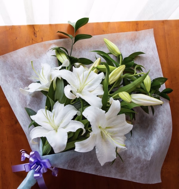 開花直前の蕾の状態のものを発送前日に切り、一晩水揚げしてからお送りしますので、花持ちが良く、長い期間ユリをお楽しみいただけます。