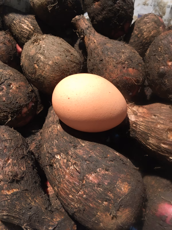 Lサイズの玉子を置いてみました、今年の長雨で、大きい赤目芋さんです。