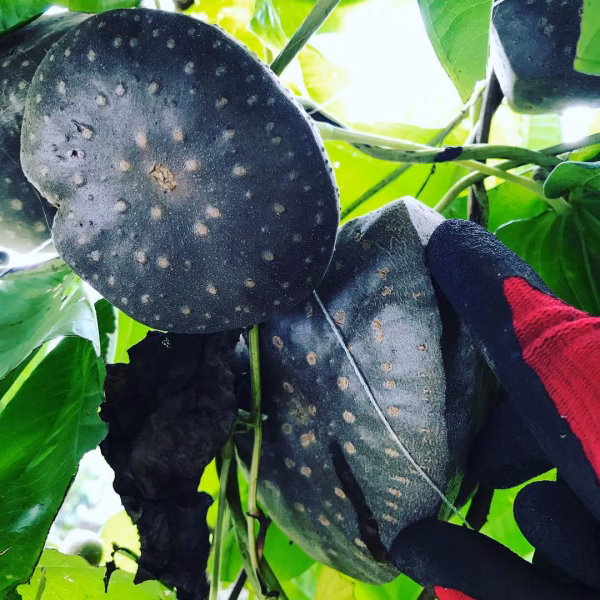 常温保存で来春まで何食わぬ顔で保ちますので、それまで置物として鑑賞されてもいいですし(鑑賞価値は高い)、来春に芽が出て来たら土に植えればグングン伸びます(ツル性なので、グリーンカーテンの要領で這わせると来年は宇宙芋祭りとなります笑)