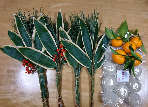 正月飾りの風習は古来からあり地域によって異なりますが、神棚に飾る「松竹梅」とお仏壇に飾る赤豆(南天)つきの「松竹梅」、それと鏡餅の上に乗せる葉付きミカン、2021年の健康を願っての菊芋餅をセットにしました。