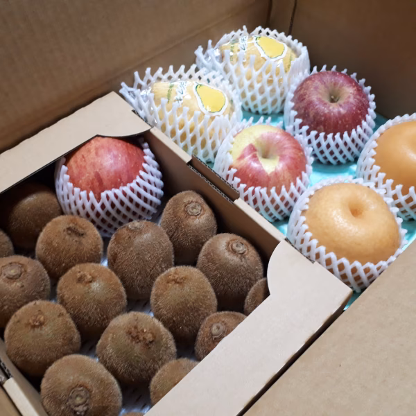 ※こちらのキウイは未追熟ですので、すぐに食べられません。 追熟の方法と、追熟用のリンゴ、ビニール袋が付属しています。 食べきりサイズの4種setです。 内容物 レクチエ 平均350g フジリンゴ 平均315g 新興梨 平均350g 各2玉 計6玉 キウイL玉(約125g) 16個 約2㎏ 追熟用リンゴ(オマケ)