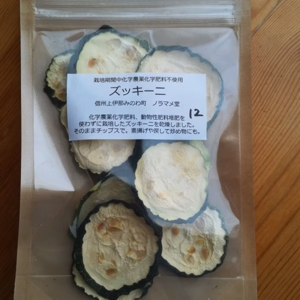 化学農薬、化学肥料を使わずに栽培したズッキーニを手軽に食べられるよう乾燥させました。