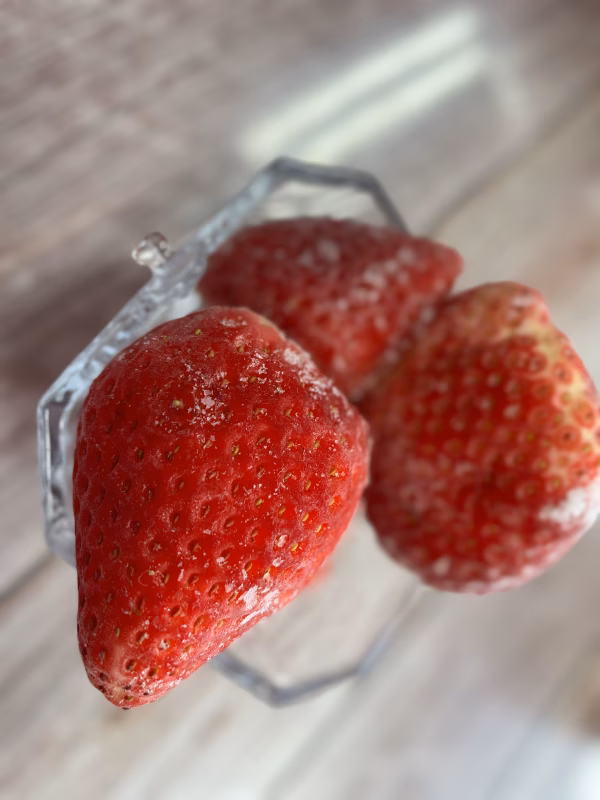 朝採りいちごをその日に選別、ヘタをカットしてすぐに真空パックして冷凍します。先詰まり果実、変形果実も含みます。収穫時、傷などがある場合はその箇所をカットしています。