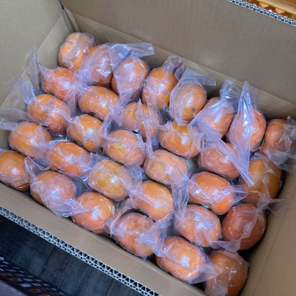 「冷蔵熟成柿」とは、11~12月に収穫した富有柿の鮮度をそのままに年明けにも味わって頂けるように、冷蔵設備で特別な温度管理のもと大切に保存された柿です。