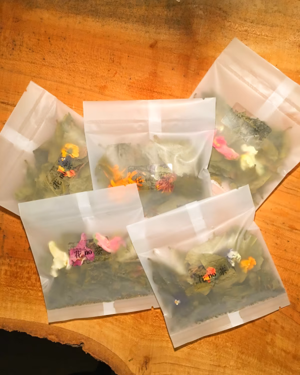 茶葉は滋賀県東近江市産の在来主、無農薬、手摘みの一般にはほとんど出回らない政所茶の平番茶になります。透き通る黄金色のお茶が淹れられます。食用花を浮かべ風情も楽しんでください。