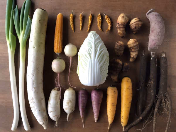 固定種とは、生育の勢いや姿形の揃いが良い交配種(F1)の流通に押されている昔ながらの作物です。手間ひま掛けて実った種をまけば、同じ特徴を持った作物の収穫を続けることができます。