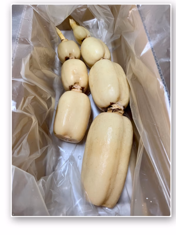 蓮根の部分ごとに食感が変わり、頭の方から柔らかく酢の物やサラダに真ん中は煮物や揚げ物に下の方は水分が少なくでんぷんが多く粘りがあるので、ハンバーグやつみれなどにしていただけると更なる食感が楽しんでいただけます。