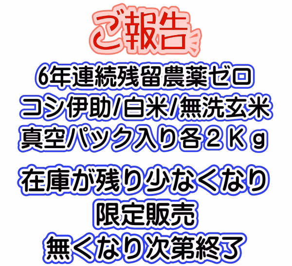 コシヒカリ伊助は、新潟県より無農薬・無化学肥料栽培の特別栽培農産物の指定と新潟県の検査機関によりサンプル米が2015年産より残留農薬がゼロ認定を2年産まで連続で受けております。
