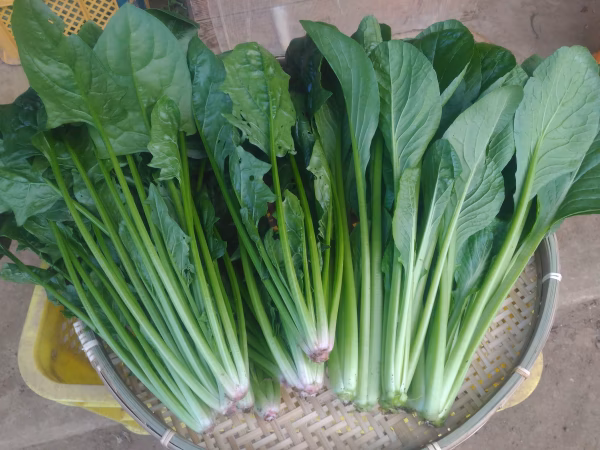 天候が良すぎて育ちすぎちゃいました、ビッグサイズの小松菜とほうれん草です。小松菜を500g、ほうれん草を500gのセットでお届けします。